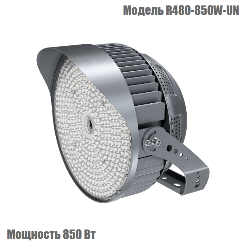Круглосимметричный светодиодный прожектор 850 Вт, серия R480-850W-UNR480-850W-UN. Легкий мачтовый круглосимметричный прожектор, мощностью 850 Вт. По световому потоку превышает прожектора с лампами типа МГЛ более 1500 Вт. Прожектор выполнен в круглосимметричном корпусе с драйверами, установленными в отдельном боксе, задней части корпуса и отделенным от светодиодного модуля для наилучшего охлаждения. Это оптимальный инструмент для освещения больших площадей с мачтовых опор и зданий. Основное применение - освещение спортивных и промышленных объектов. Где требуется большая светоотдача с высокой концентрацией луча. Прожектор с легкостью поможет Вам добиться необходимого уровня освещенности на объектах разного уровня сложности.