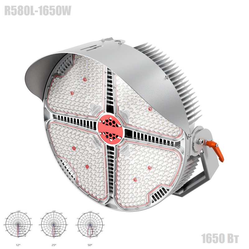 Круглосимметричный мачтовый светодиодный прожектор 1650Вт, серия R580L-1650W Серия R580 тип L. Мощный мачтовый круглосимметричный светодиодный прожектор, мощностью 1650 Вт. Основное применение прожектора в составе высоко мачтовых осветительных установок для освещения спортивных и промышленных объектов. Где требуется большая светоотдача с высокой концентрацией луча.